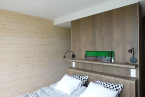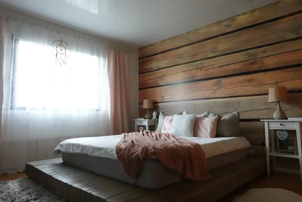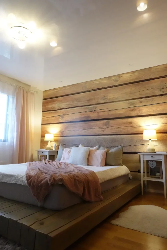Custom Bedroom – Designer Wallpaper, Stretch Ceiling & Bespoke Bed Frame